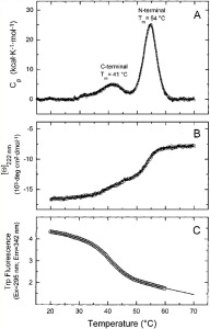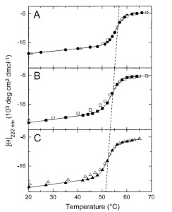 Circular Dichroism (CD) relies on the differential absorption of left and right circularly polarised radiation by chromophores which either possess intrinsic chirality or are placed in chiral environments. Proteins possess a number of chromophores which can give rise to CD signals. In the far UV region (240-180 nm), which corresponds to peptide bond absorption, the CD spectrum can be analysed to give the content of regular secondary structural features such as a-helix and b-sheet. The CD spectrum in the near UV region (320-260 nm) reflects the environments of the aromatic amino acid side chains and thus gives information about the tertiary structure of the protein. Other non-protein chromophores such as flavin and haem moieties can give rise to CD signals which depend on the precise environment of the chromophore concerned. Because of its relatively modest resource demands, CD has been used extensively to give useful information about protein structure, the extent and rate of structural changes and ligand binding. In the protein design field, CD is used to assess the structure and stability of the designed protein fragments. Studies of protein folding make extensive use of CD to examine the folding pathway the technique has been especially important in characterising molten globule intermediates which may be involved in the folding process. CD is an extremely useful technique for assessing the structural integrity of membrane proteins during extraction and characterisation procedures. The interactions between chromophores can give rise to characteristic CD signals. This is well illustrated by the case of the light harvesting complex from photosynthetic bacteria, where the CD spectra can be analysed to indicate the extent of orbital overlap between the rings of bacteriochlorophyll molecules. It is therefore evident that CD is a versatile technique in structural biology, with an increasingly wide range of applications. From: Sharon M. Kelly, Nicholas C. Price. The Use of Circular Dichroism in the Investigation of Protein Structure and Function. Current Protein & Peptide Science. Contact: Roman Szczepanowski, This email address is being protected from spambots. You need JavaScript enabled to view it. or Krzysztof Skowronek, This email address is being protected from spambots. You need JavaScript enabled to view it.